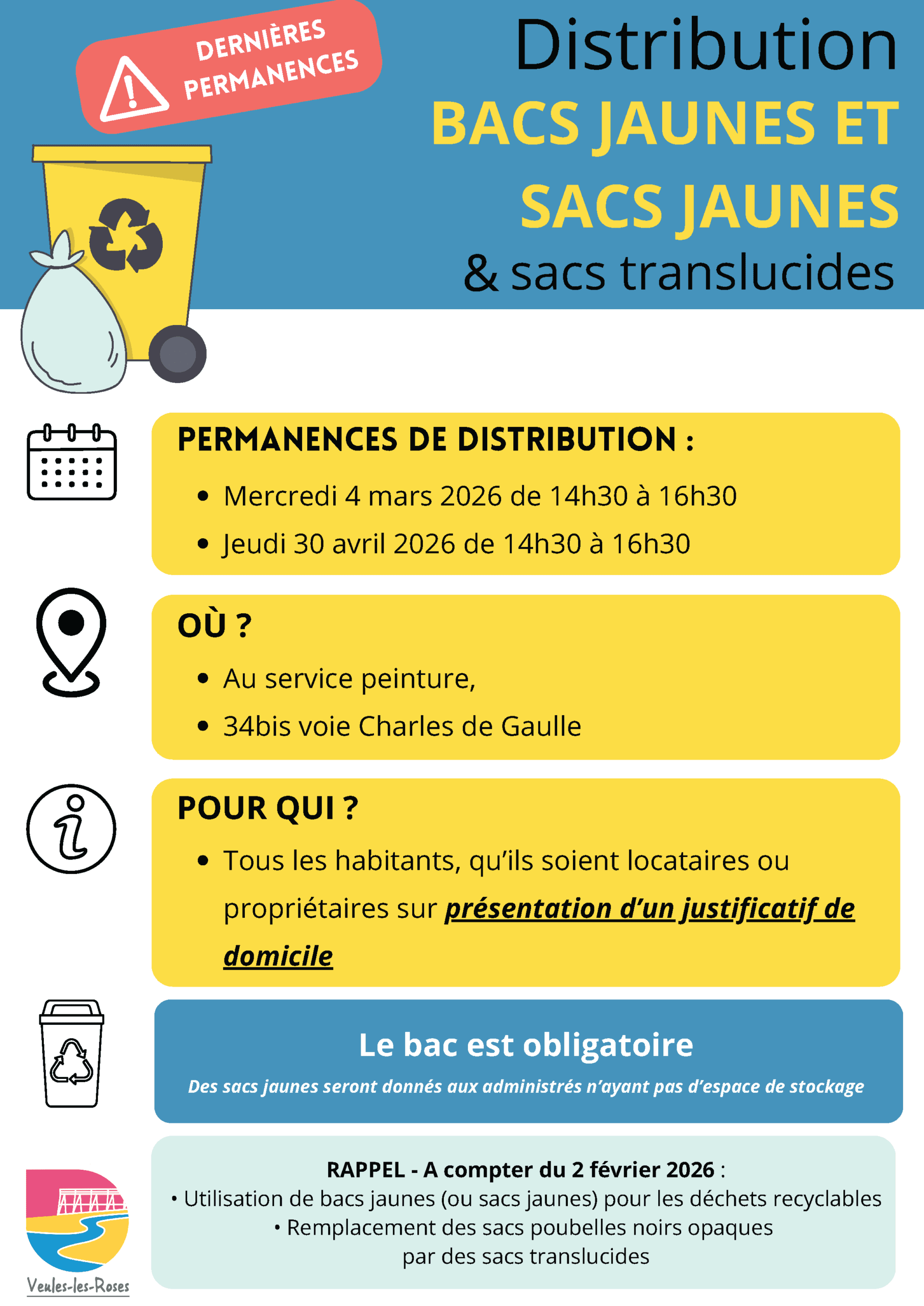 Permanences : distribution des bacs jaunes (sacs jaunes) et des sacs translucides
